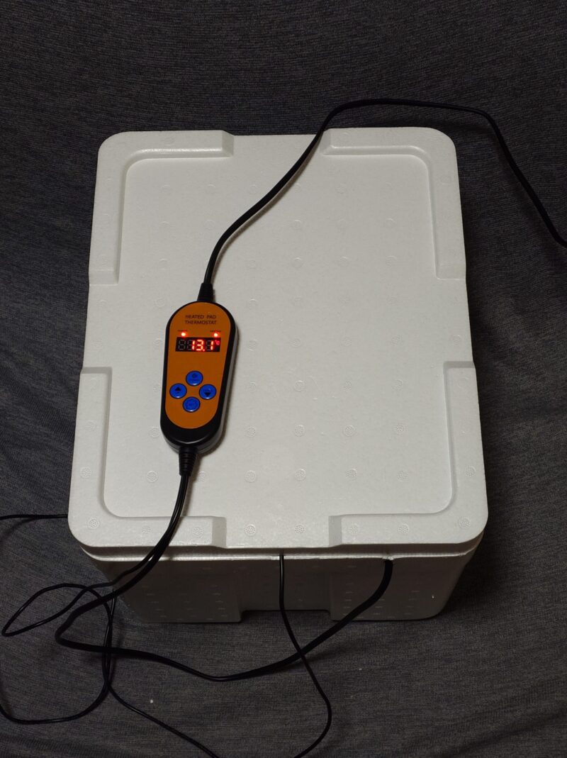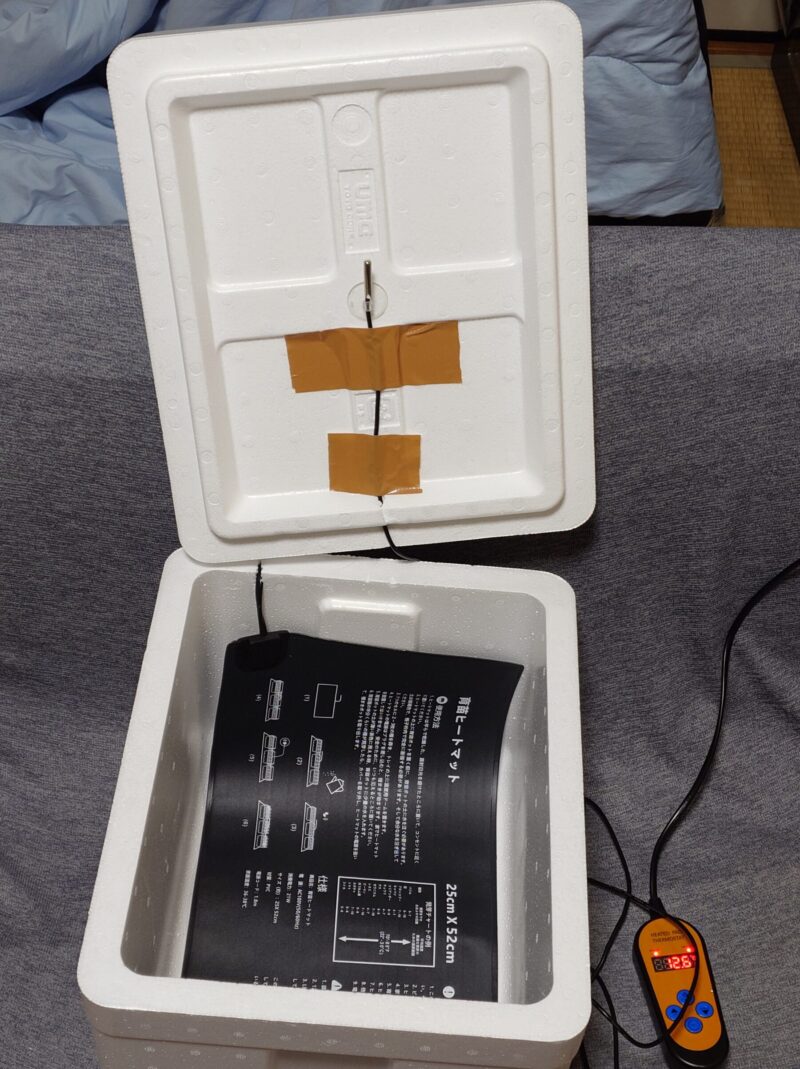 夏以外で気温が低い場合は、下記のような手作りホイロがお勧めです。オーブンの発酵機能を使っても良いですが、発酵中にオーブンが使えないのはなかなか不便です。育苗ヒートマットは、温度を15~40℃の範囲で設定できます。Amazonで3000円程度で売ってます。タイマー機能はないので、キッチンタイマーを併用します。専用ホイロよりも格安で長時間の低温オーバーナイト発酵も可能です。温度センサーを蓋にガムテープでとりつけてます。発泡スチロールボックスは、釣り具コーナーで700円程度です。
