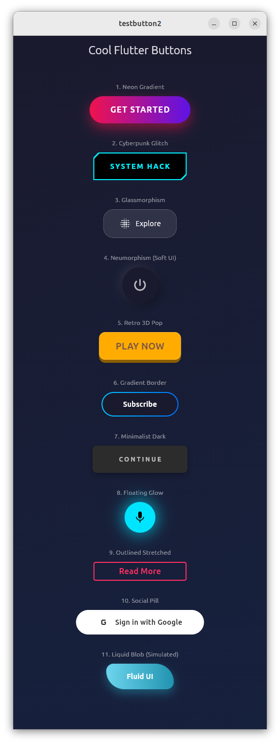 そこで、Geminiに、「かっこいいFlutter用のボタンを10個ぐらい作って」とお願いしたら、秒で作ってもらえました。